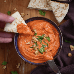 Dans la lignée du houmous, il y a le muhammara, un mezze originaire de Syrie à déguster avec du pain pita grillé. Composé de poivrons rouges, huile d’olive, cerneaux de noix, chapelure, ail, jus de citron et mélasse de grenade. C’est le dip qui va faire fureur auprès de vos invités, vous n’avez plus qu’à vous lancer ! Pour la recette c’est par ici.